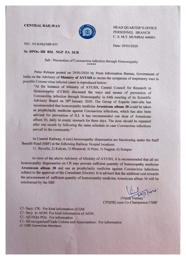कोरोनापासून बचाव करण्यासाठी मध्य रेल्वेने आयुष मंत्रालयाच्या शिफारशीनुसार आपल्या कामगारांना होमिओपॅथीच्या आर्सेनिक अल्बम 30 या गोळ्यांचे वाटप सुरू केले आहे। कोरोनाचे आक्रमण परतवून लावण्याच्या दृष्टीने माणसाची रोग प्रतिकार शक्ती वाढवण्यासाठी त्या गोळ्या उपयुक्त आहेत,असे आयुष मंत्रालयाने म्हटले आहे। त्या पार्श्वभूमीवर, त्या गोळ्यांचे कामगारांना वाटप करण्याबाबत रेल्वेने काढलेले हे परिपत्रक। मध्य रेल्वेत भायखळा, कल्याण, भुसावळ, पुणे,नागपूर, सोलापूर अशा सहा ठिकाणी होमिओपॅथीच्या डिस्पेन्सरीज आहेत।