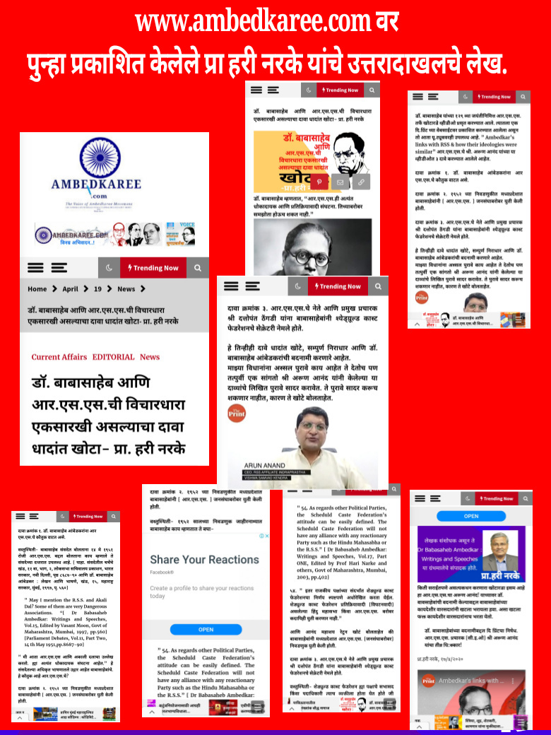 मुंबई,दि 20: भारतीय संविधानाचे जनक डॉ बाबासाहेब आंबेडकर यांचे विचार हे राष्ट्रीय स्वयंसेवक संघाशी मिळतेजुळते आहेत, असा दावा करणारे खोटारडे व्हिडीओ संघातर्फे भीम जयंतीला प्रसृत करण्यात आले आहेत। पण ‘द प्रिंट’ च्या वेबसाईटवर झलकवण्यात आलेल्या त्यातील एका व्हिडीओच्या खोटारडेपणाचा फुले-आंबेडकरी इतिहासाचे प्रख्यात संशोधक प्रा हरी नरके यांनी पोलखोल केले आहे।