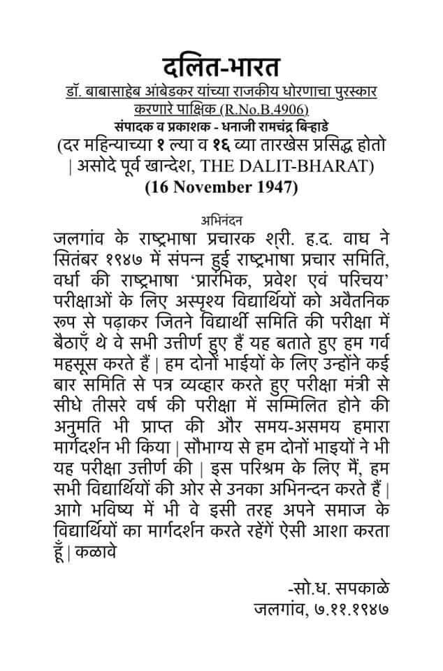 आंबेडकरी साहित्य और आंदोलन में मराठी भाषा के साथ-साथ महाराष्ट्र के कई कवि, गीतकार और कार्यकर्ता रहें हैं जिनकी रचनाएँ तो मिलती हैं लेकिन उनकी जानकारी नहीं मिल पाती। आंबेडकरी साहित्य और आंदोलन का महाराष्ट्र सहित देश के अन्य हिस्सों में हिंदी के प्रसार-प्रचार में विशेष योगदान रहा हैं। अपने शोध के दौरान मुझे स्वतंत्रता पूर्व अस्पृश्य विद्यार्थियों के हिंदी पढ़ने के कुछ दस्तावेज़ मिले हैं उसमें हिंदी पढ़नेवाले एक विद्यार्थी सो.ध.सपकाले द्वारा दलित भारत पाक्षिक में लिखा गया (७.११.१९४७) यह अभिनंदन पत्र आप देख सकते हैं’।